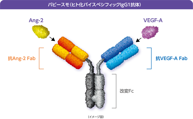 血管内皮増殖因子-A(VEGF-A)およびアンジオポエチン-2(Ang-2)の働きを阻害するバイスペシフィック抗体により、nAMD、DMEに関与する2つの疾患経路を阻害。今までは、抗VEGFのみを阻害する注射液しかありませんでした。